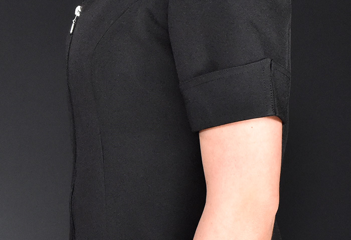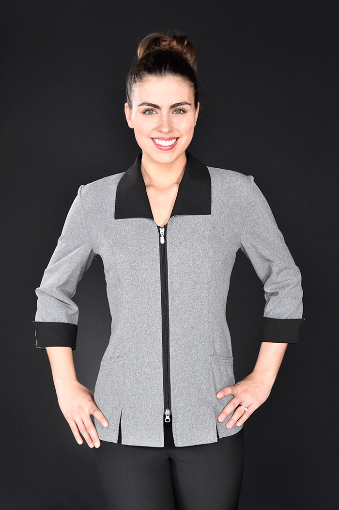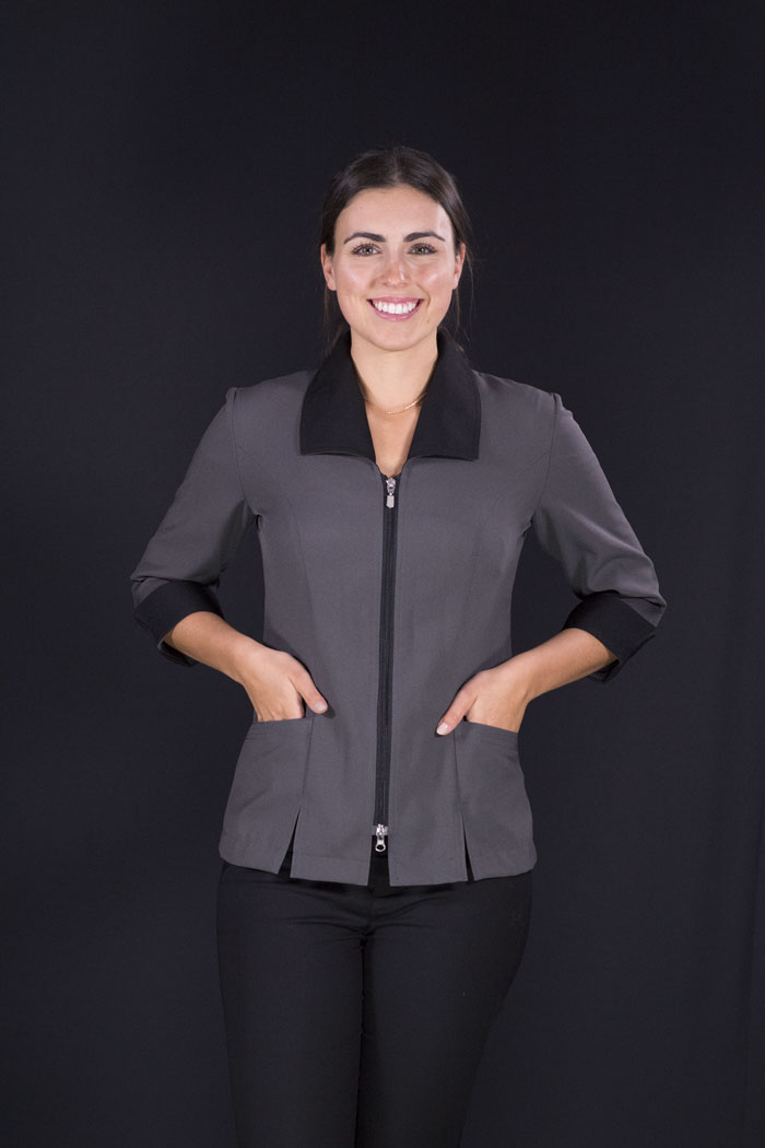 Style tailleur, aisance aux épaules, soufflets discrets, manches finies avec poignets reversés, col matelot, longueur mi-fesse, 2 poches avant, ouverture avant et arrière pour confort aux hanches, fermeture éclaire double curseur.
