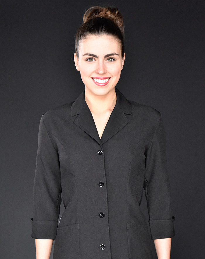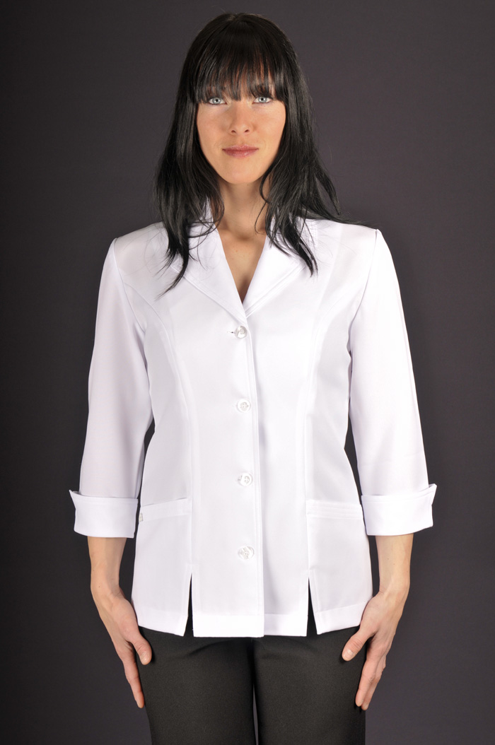 Style tailleur, aisance aux épaules, soufflets discrets, manches finies avec poignets reversés, col échancré, longueur mi-fesse, 2 poches avant, ouverture avant et arrière pour confort aux hanches.
