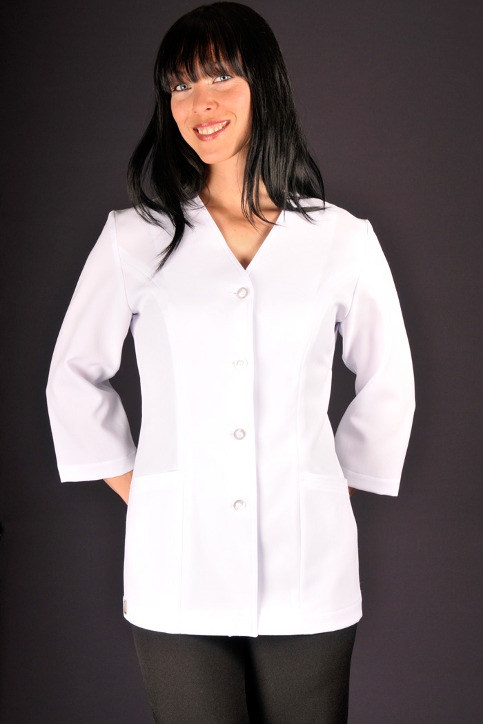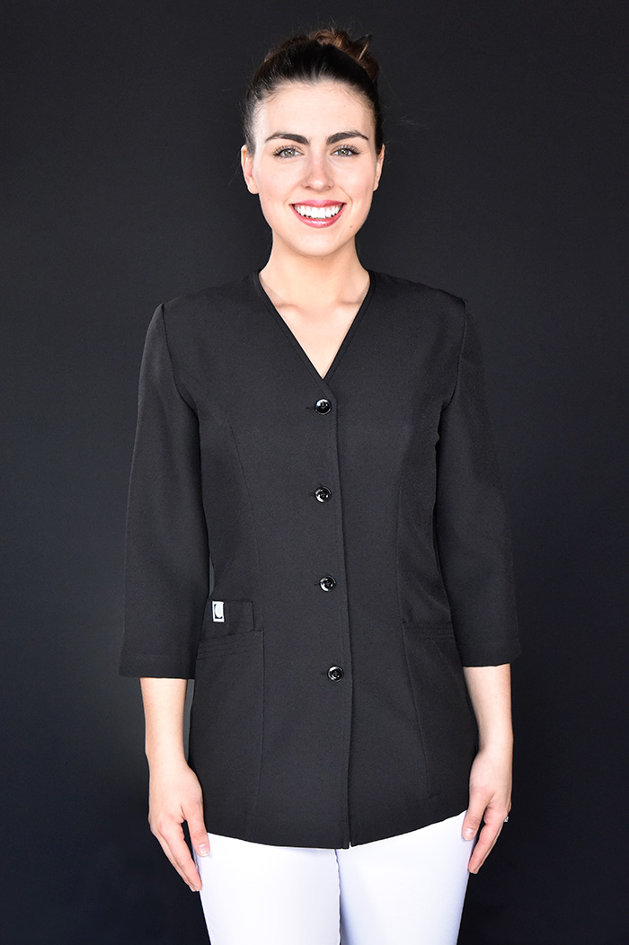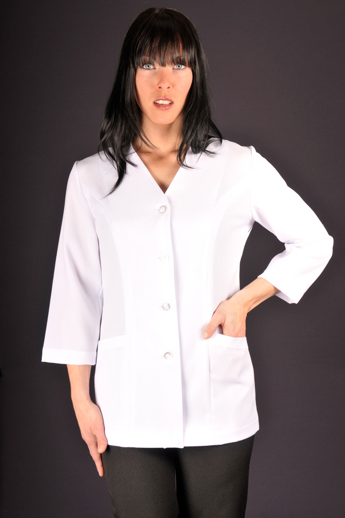 Style tailleur, aisance aux épaules, soufflets discrets, manches droites sans finition, col en V, longueur bas de fesse, 2 poches avant.
