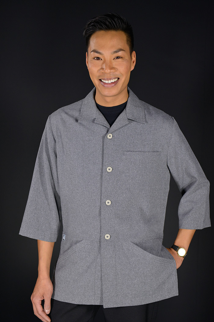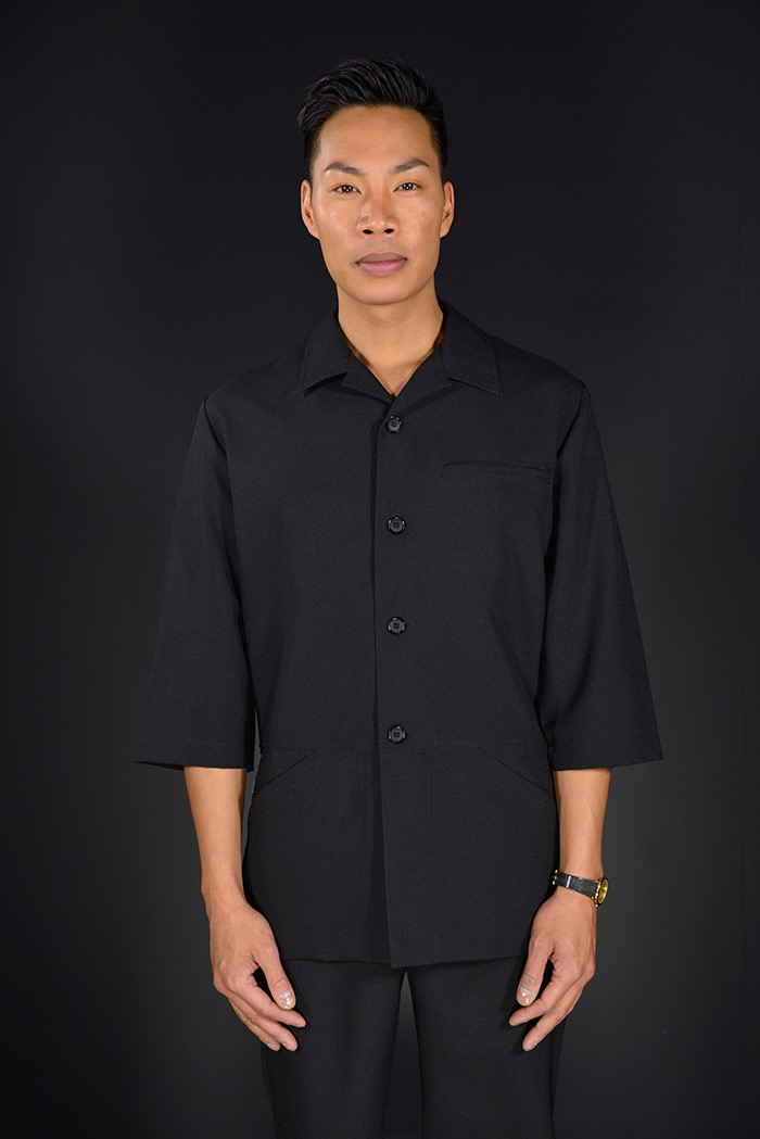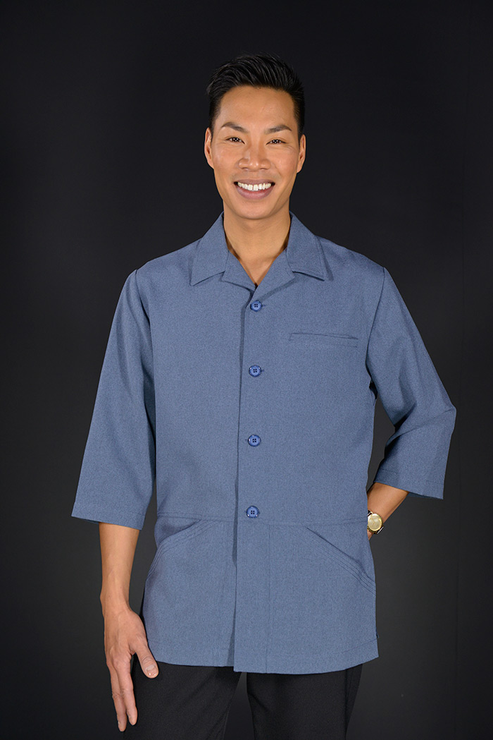 Style veste col chemise, aisance aux épaules, soufflets discrets, boutons devant, découpe de taille surpiqué. longueur bas de fesses, 2 poches avant surpiquées, fentes latérales pour confirt aux hanches, poche buste cachée.